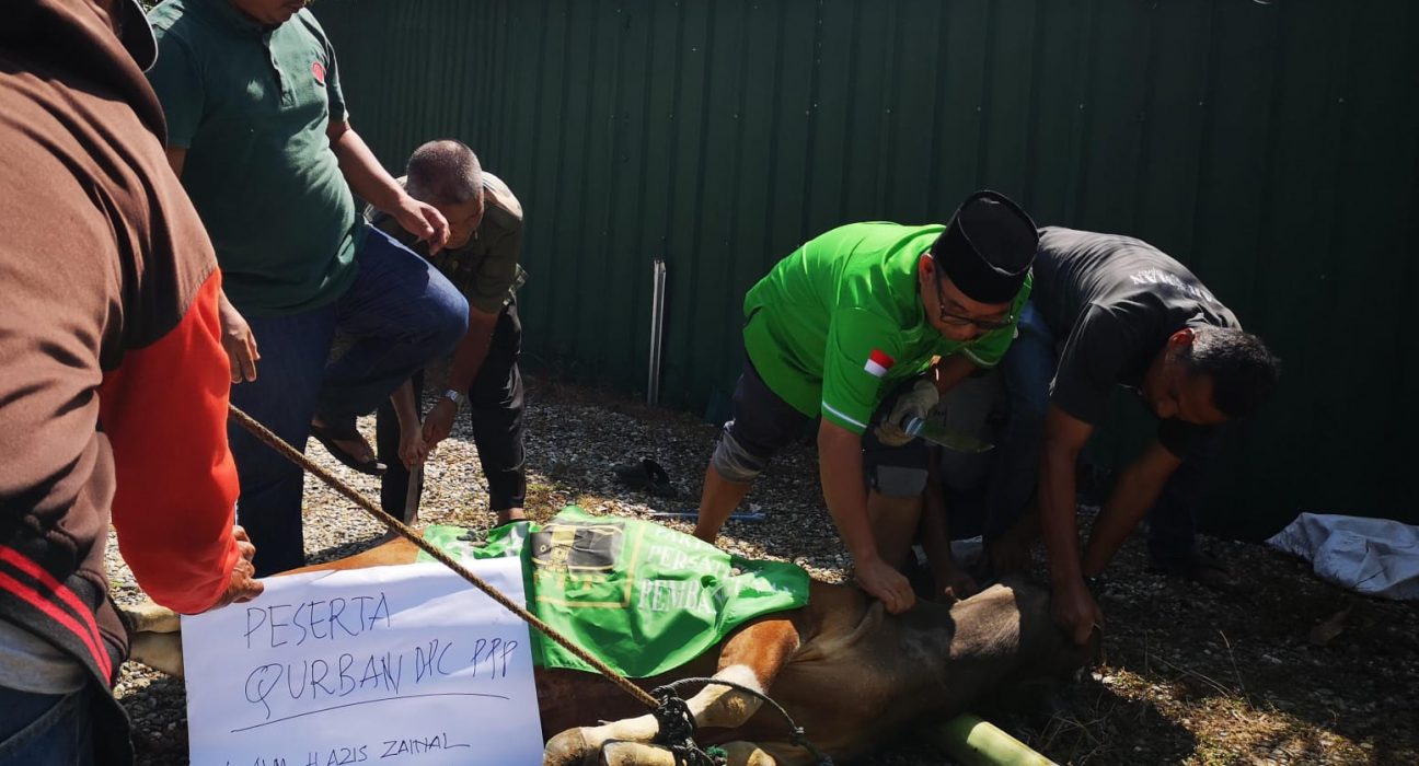 Pemotongan hewan kurban dilakukan oleh Bendahara PPP Kampar Habiburrahman SAg MPd didampingi pengurus DPC PPP Kampar di antaranya Said Abdullah dan Misra Hayati.