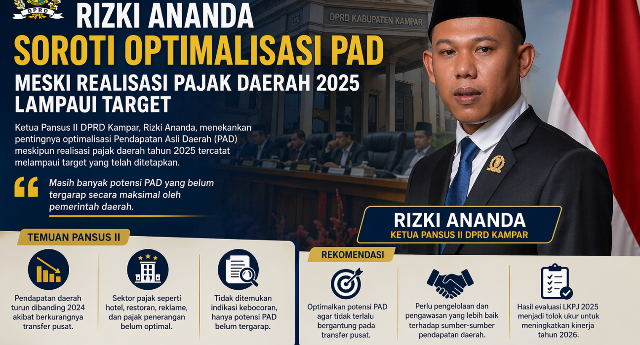 KAMPAR — Ketua Panitia Khusus (Pansus) II DPRD Kabupaten Kampar, Rizki Ananda, menekankan pentingnya optimalisasi Pendapatan Asli Daerah (PAD) meskipun realisasi pajak daerah tahun 2025 tercatat melampaui target yang telah ditetapkan pemerintah daerah.