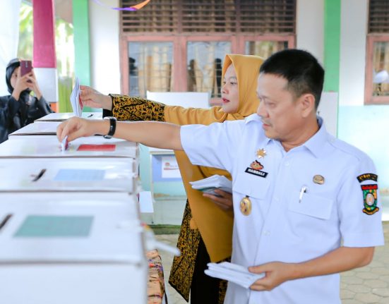 temponews45, Kampar – Usai melaksanakan pencoblosan surat suara di TPS Pj Bupati Kampar H. Hambali SE, MBA, MH bersama istri