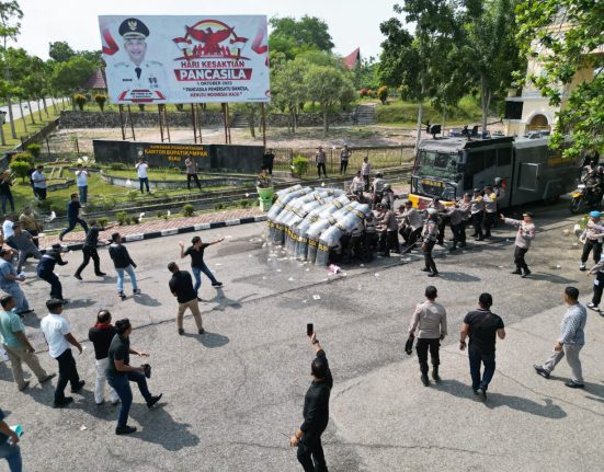 BANGKINANG – Polres Kampar menggelar simulasi sistem pengamanan kota (Sispamkota) di Lapangan Pelajar Bangkinang, Selasa (10/10/2023). Simulasi ini merupakan bagian