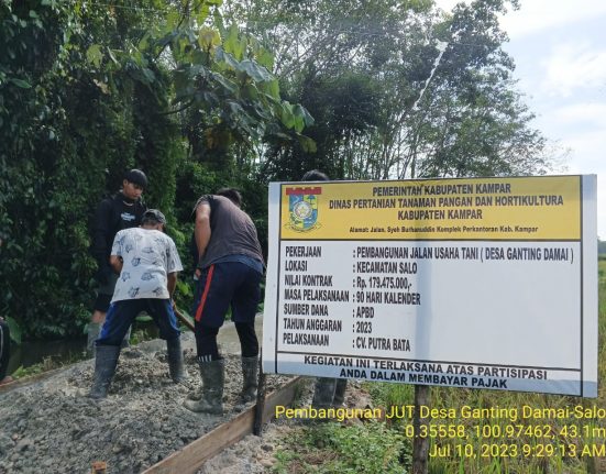 BANGKINANG – Dinas Pertanian Tanaman Pangan dan Hortikultura Kabupaten Kampar membangun jalan usaha tani pada tahun anggaran 2023 di empat