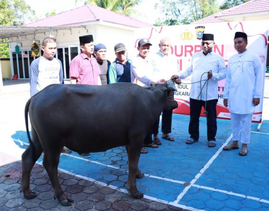 BANGKINANG – Kapolres Kampar AKBP Didik Priyo Sambodo SIK memimpin pemotongan hewan kurban Polri Presisi pada Hari Raya Idul Adha