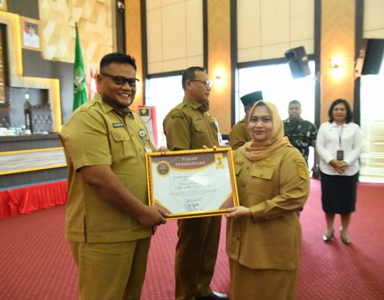 BENGKALIS – Bupati Bengkalis Kasmarni secara resmi menyerahkan Penghargaan Hasil Penilaian Mandiri Pemantauan dan Evaluasi Kinerja Penyelenggara Pelayanan Publik (PEKPPP)