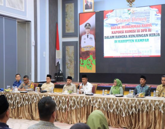 KAMPAR – Bupati Kampar Ahmad Yuzar menyambut kedatangan Ketua Kelompok Saksi (Poksi) Komisi III DPR RI, Muhammad Rahul, dalam rangka