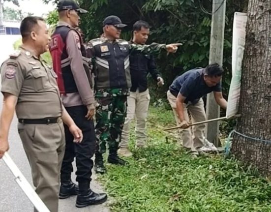 KAMPAR — Satuan Polisi Pamong Praja (Satpol PP) Kabupaten Kampar menertibkan sejumlah reklame dan banner tanpa izin yang dipasang dengan