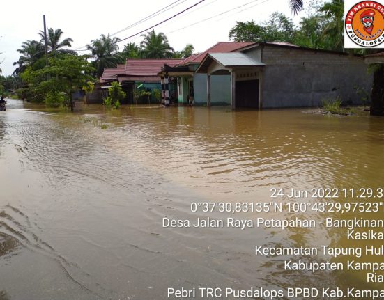 BANGKINANG – Intensitas hujan yang cukup tinggi di sejumlah wilayah di Kabupaten Kampar mengakibatkan banjir di Desa Kasikan, Kecamatan Tapung