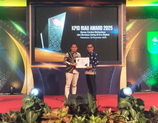 PEKANBARU – Bupati Bengkalis Kasmarni menerima penghargaan KPID Riau Award 2025 untuk kategori Tokoh Peduli Penyiaran, yang diwakili oleh Staf