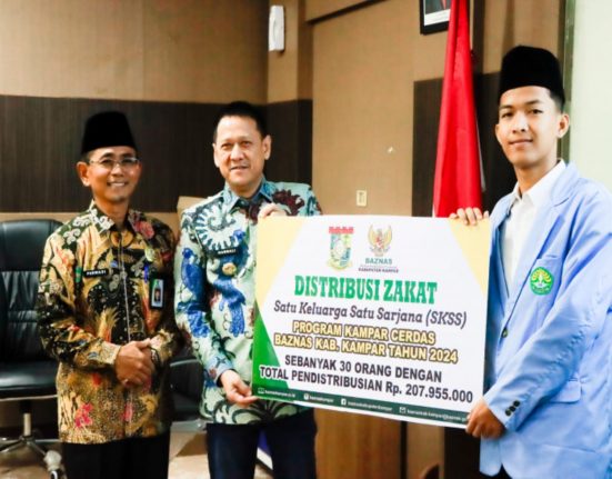 KAMPAR – Pj Bupati Kampar Hambali SE MBA MH menyerahkan bantuan Beasiswa Satu Keluarga Satu Sarjana (SKSS) di ruang rapat