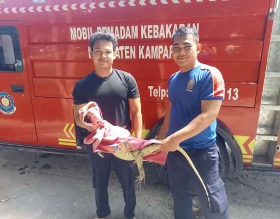 KAMPAR – Seekor hewan biawak yang didapati di area Balai Bupati Kampar, berhasil diamankan Petugas Dinas Pemadam Kebakaran dan Penyelamatan