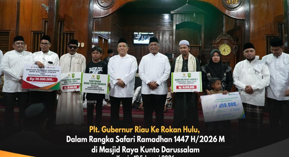 ROKAN HULU – Pemerintah Provinsi Riau resmi memulai Safari Ramadan 1447 Hijriah tingkat provinsi di Kecamatan Kunto Darussalam, Kabupaten Rokan Hulu, Kamis malam (19/2/2026). Kegiatan perdana ini disambut antusias ribuan warga yang memadati masjid dan halaman sekitarnya. Kegiatan tersebut dihadiri Pelaksana Tugas (Plt.) Gubernur Riau, SF Hariyanto, Bupati Rokan Hulu Anton, Sekretaris Daerah M Zaki, […]